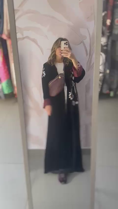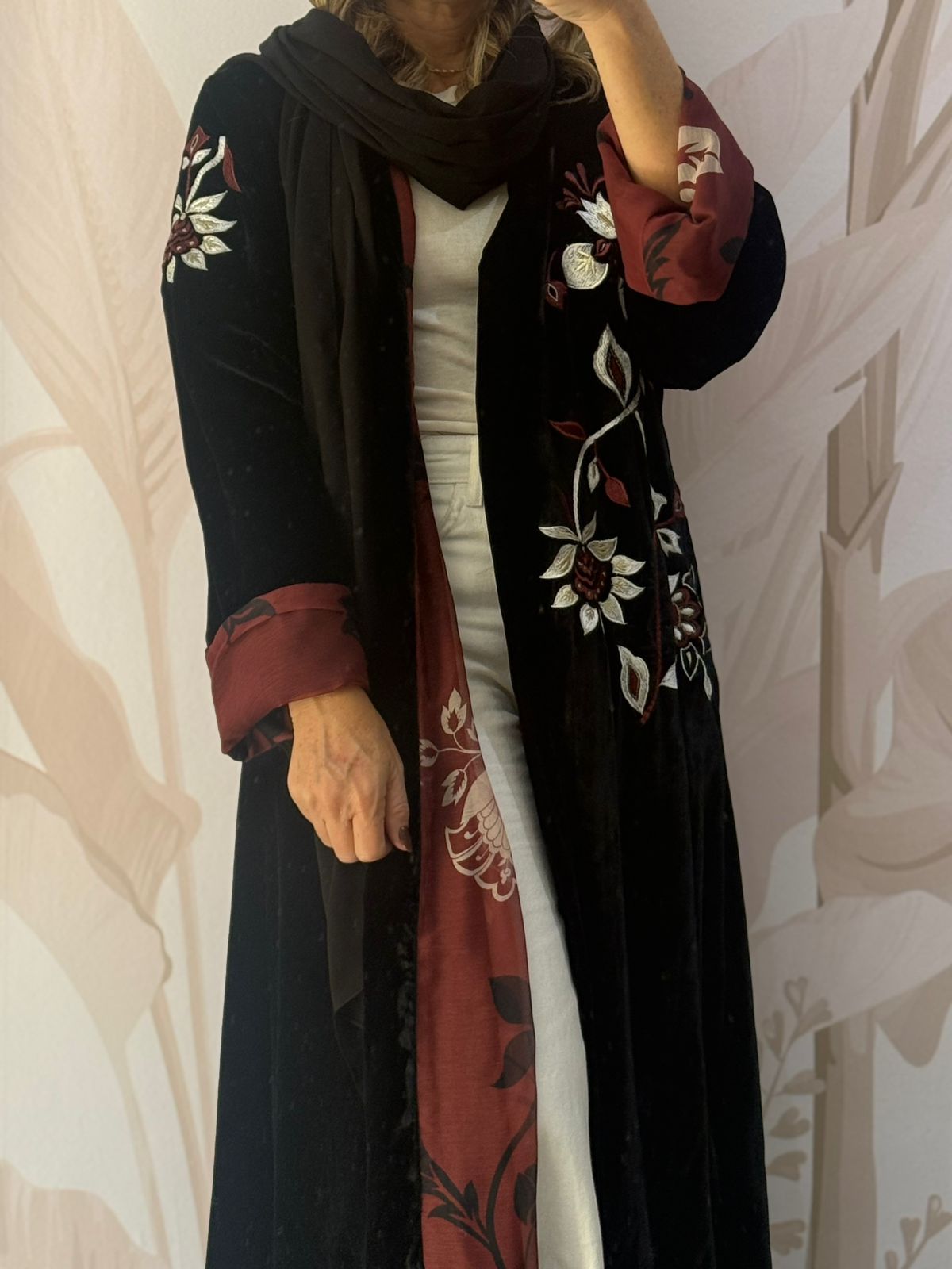Luxurious double-sided black velvet flower with a plush, tactile finish. Perfect for adding elegant dimension to abayas, hijabs, and modest fashion pieces. The reversible design offers versatility for styling and embellishment.