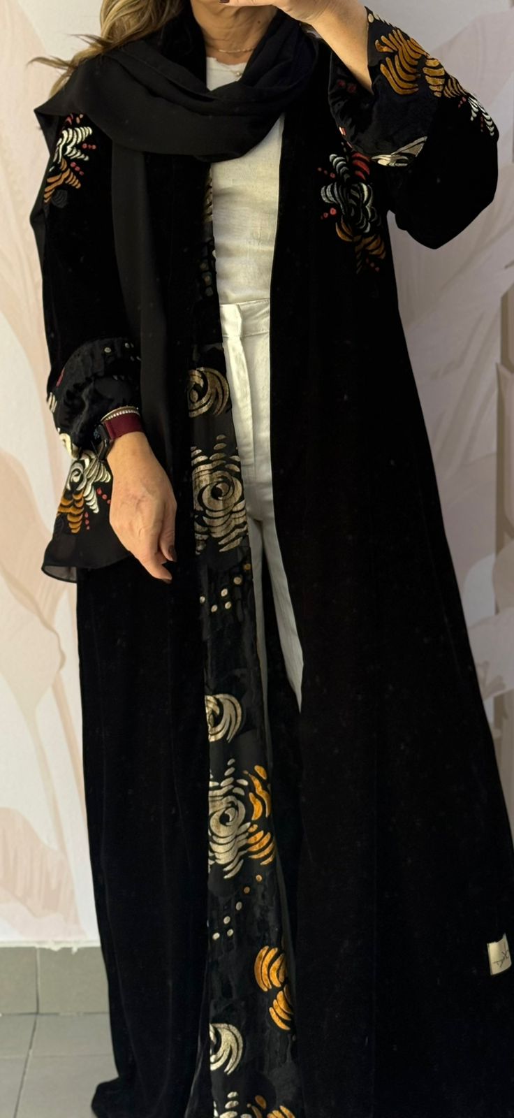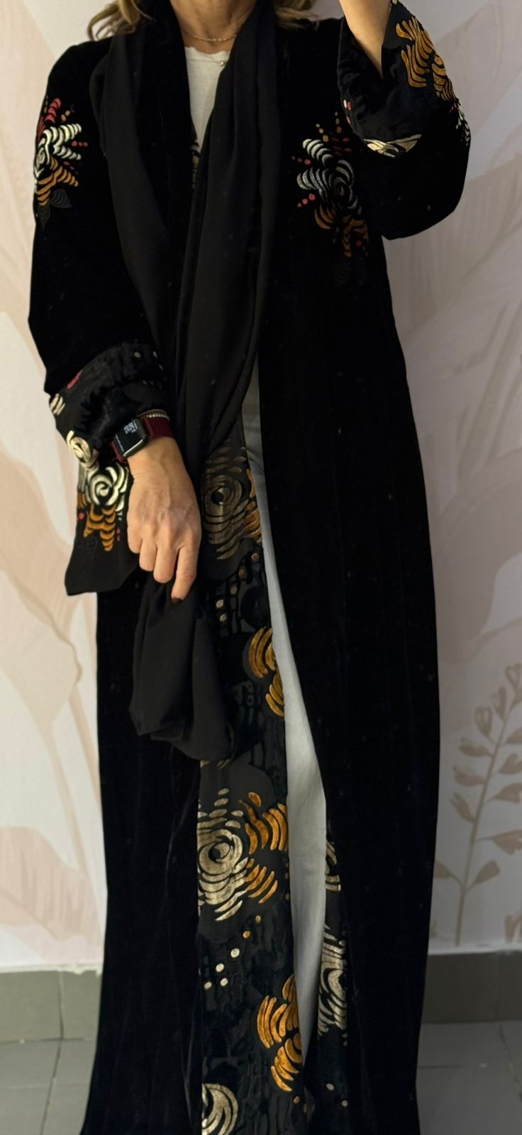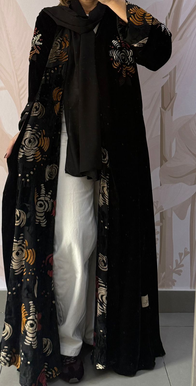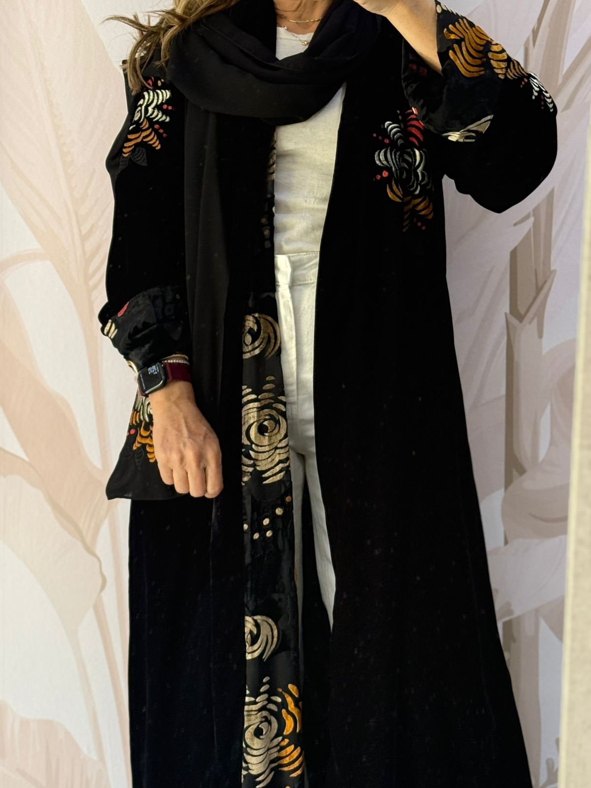 Luxurious velvet with a reversible double face design, featuring a stunning multiflowered pattern. Perfect for layering or wearing either side out, this versatile piece brings elegance and dimension to your wardrobe.