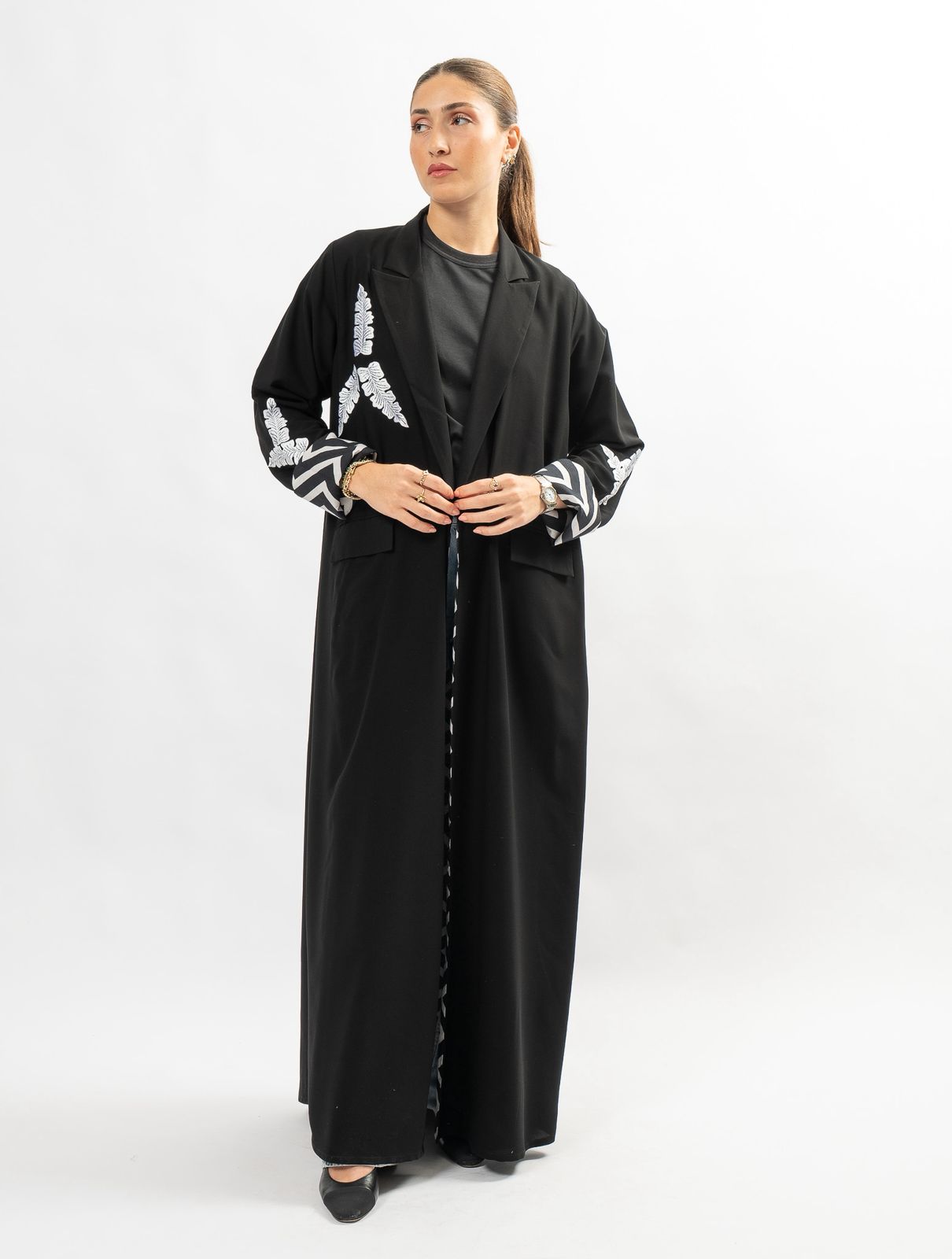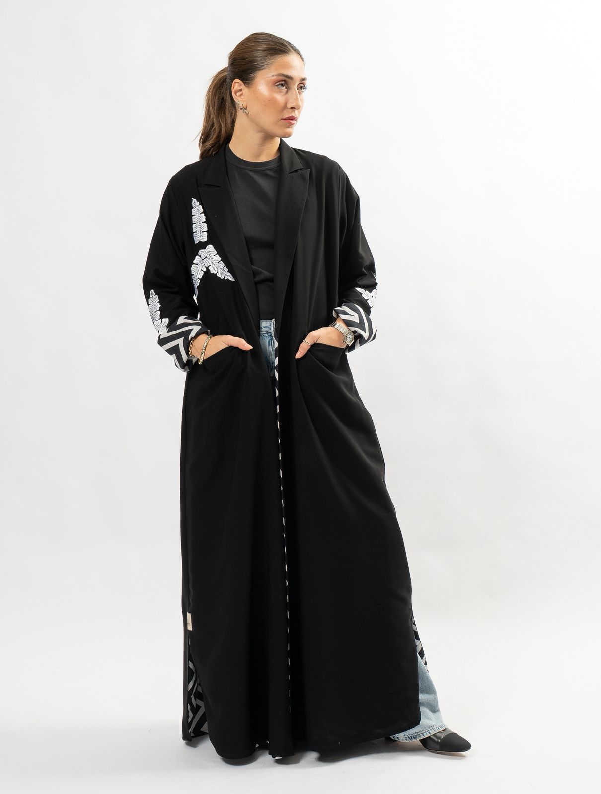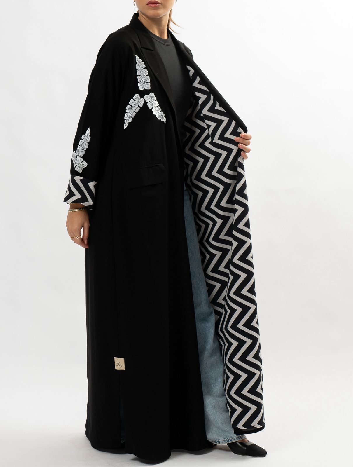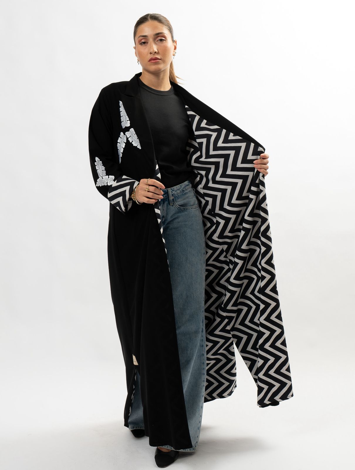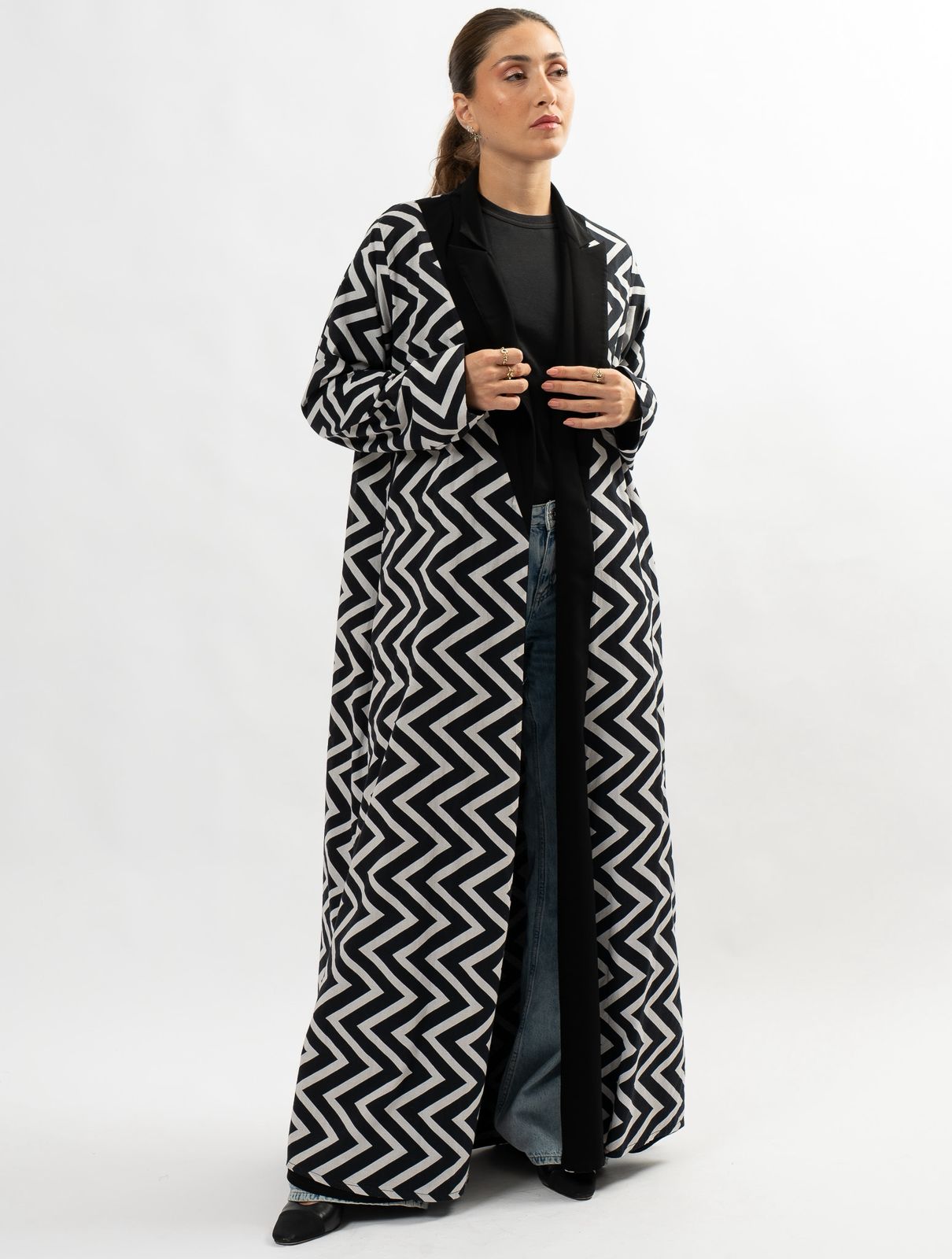 This double-sided black crepe fabric features an intricate zigzag pattern woven from cotton, combining texture and visual depth for sophisticated designs.