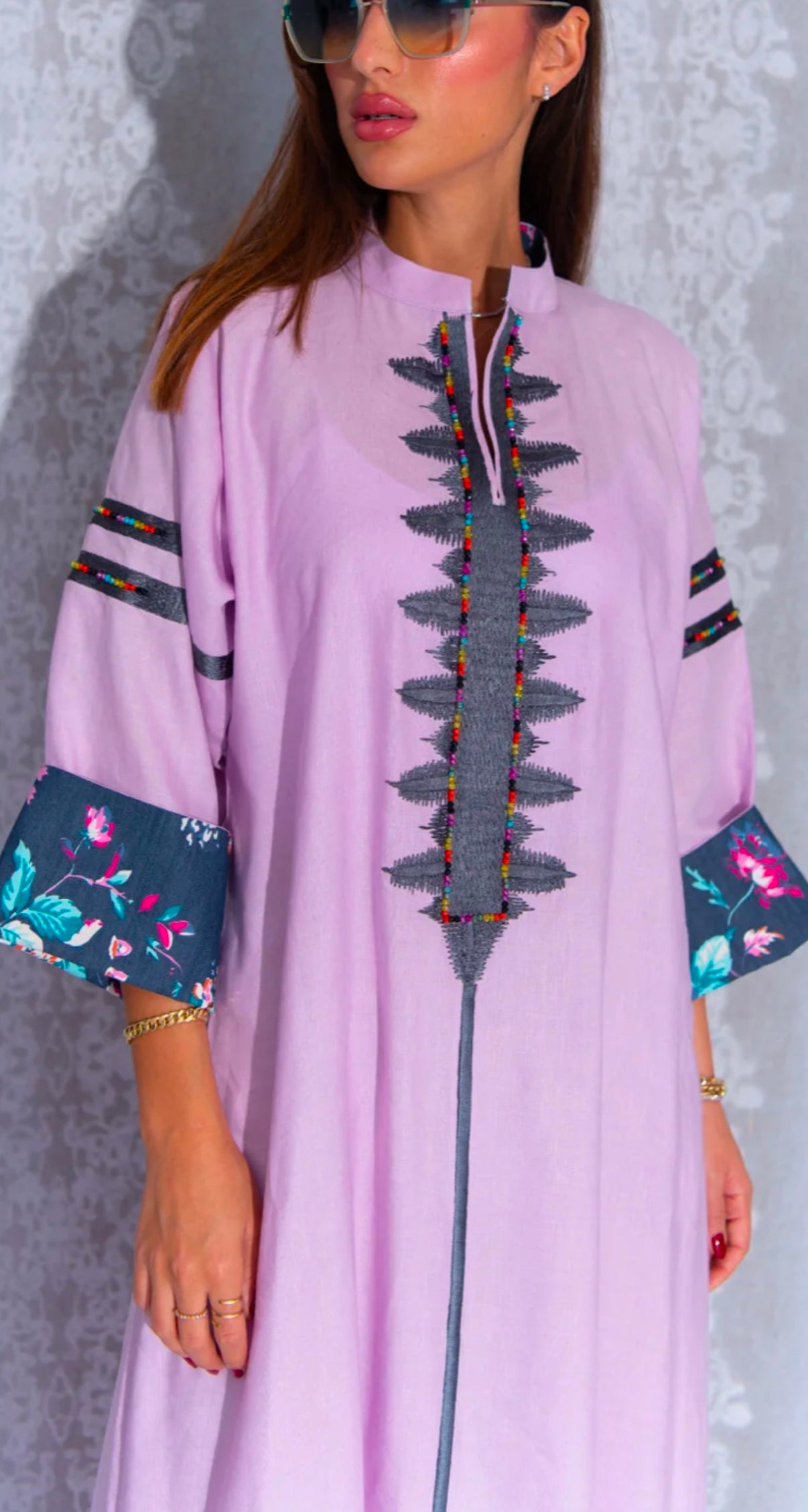 This green linen abaya is a true fusion of classic and contemporary styles, featuring vibrant red embroidery that pops against the calm green fabric. The hot pink piping adds a cohesive and chic finish, creating a dress that's perfect for both casual and formal occasions. With its comfortable linen material, it's a stylish choice for any fashion-conscious individual.