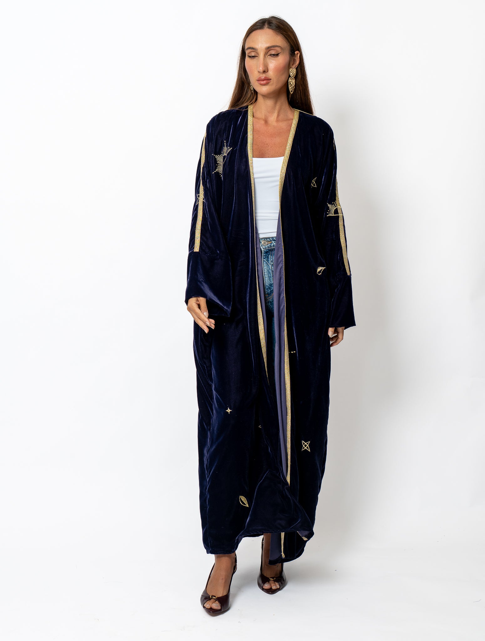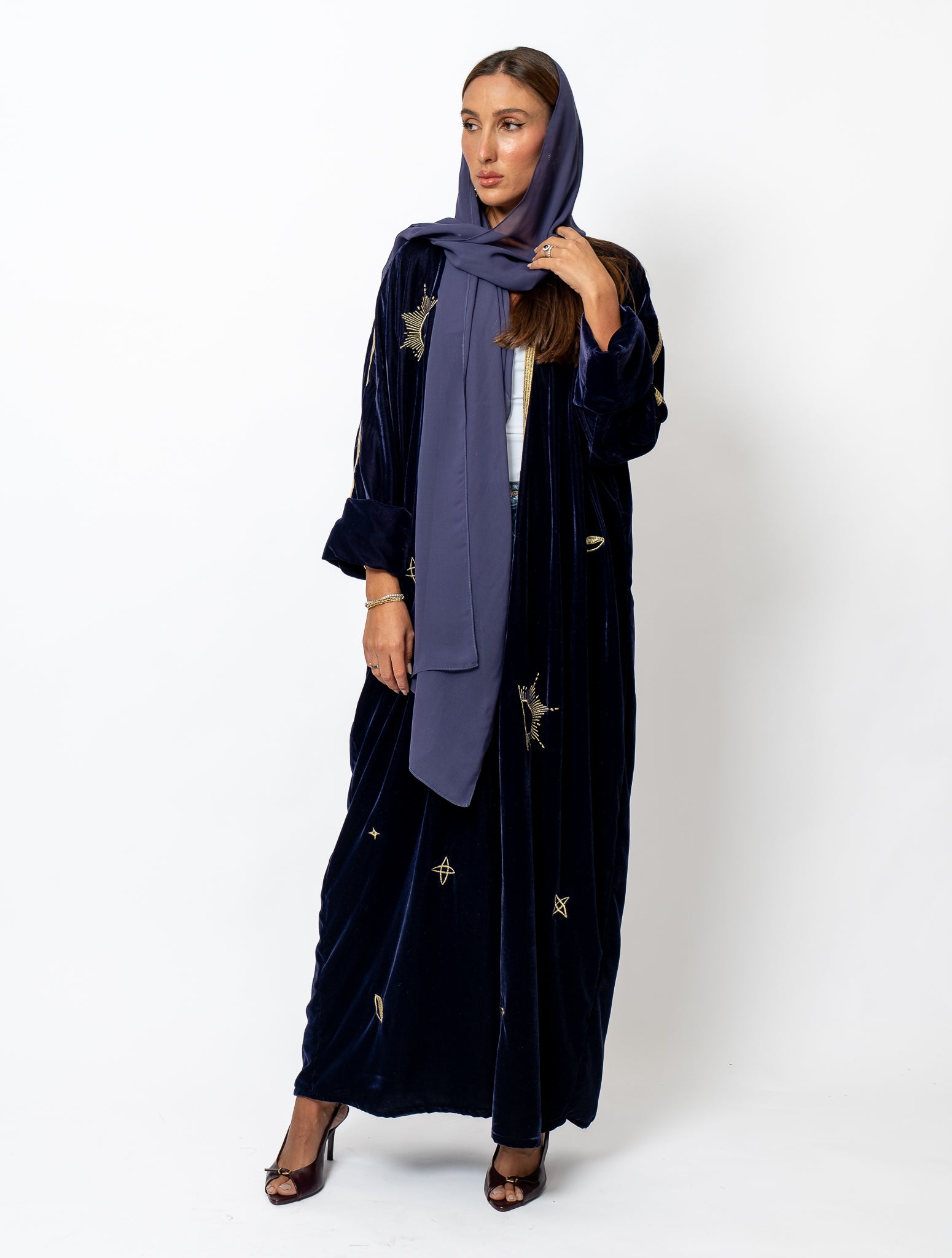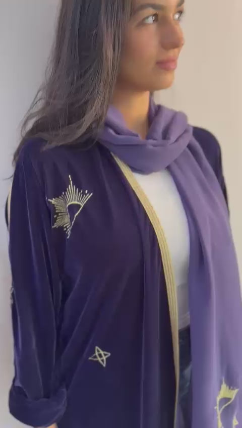 Crafted from sumptuous velvet in a rich, deep purple hue, the Purple Star abaya delivers sophisticated elegance with its luxurious fabric and refined aesthetic. This expertly designed piece combines the softness of premium velvet with a flattering silhouette, making it an ideal choice for those seeking both comfort and timeless style. The deep purple tone adds depth and dimension, ensuring this abaya stands out as a versatile wardrobe essential for any occasion.