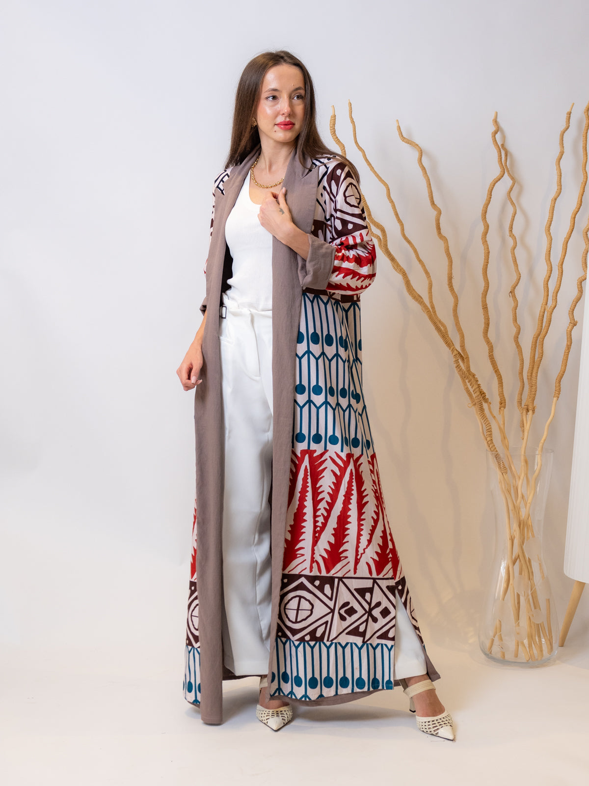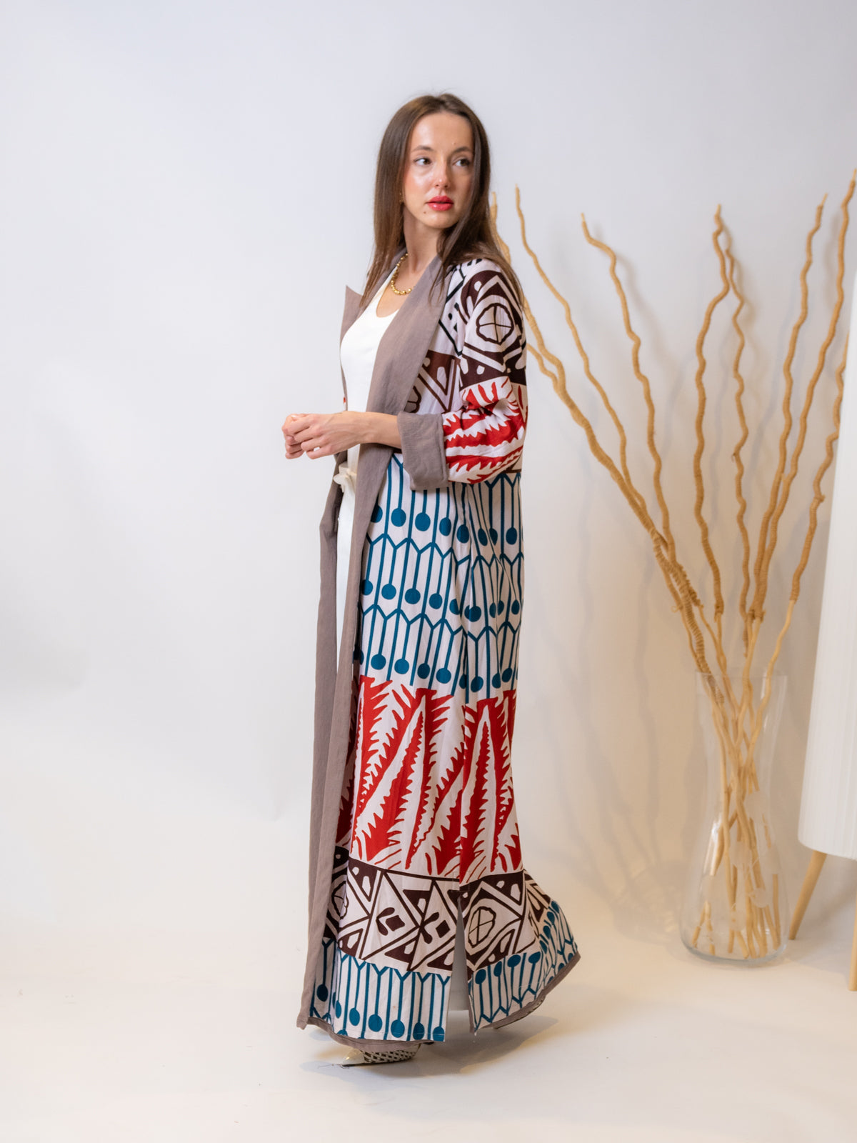 The Rona Abaya is an elegant combination of crepe and cotton double-face fabric, designed to offer comfort without compromising on style. This stunning abaya is made with high-quality crepe, which provides a refined texture and flow, while the cotton double-face design offers enhanced durability and a comfortable fit. The geometric pattern and rich brown color make it a timeless piece that blends well with both casual and formal attire.