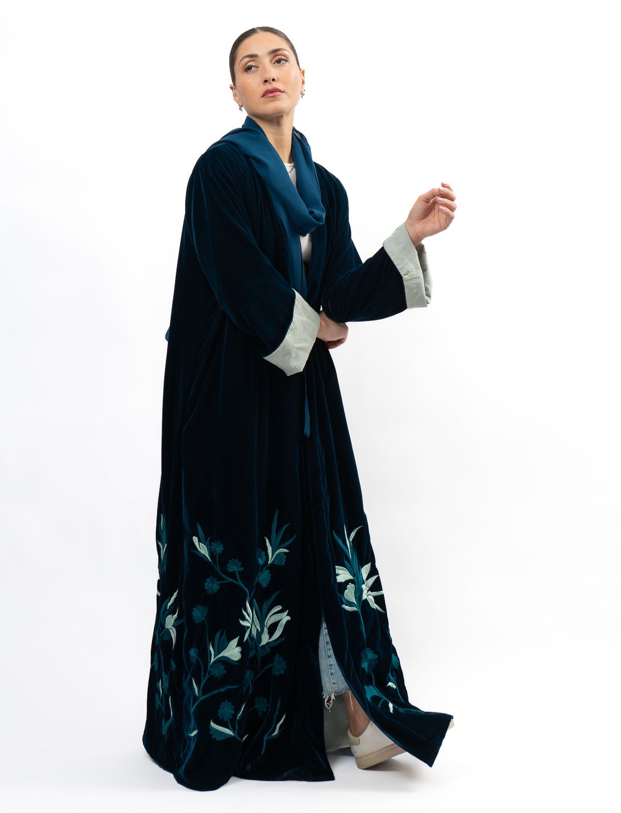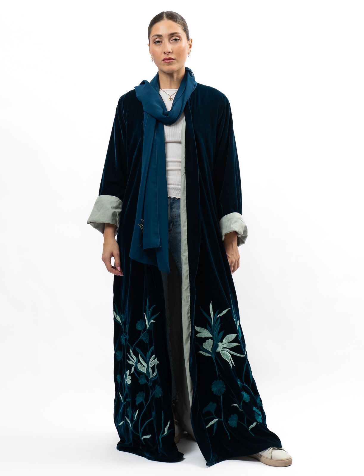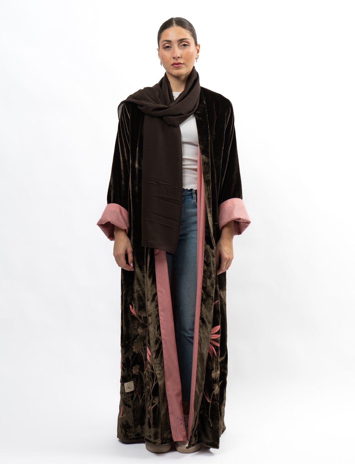 Introducing the Velvet Forest Abaya, a must-have garment for any fashion-forward individual looking to elevate their wardrobe with elegance and sophistication. This exquisite piece boasts a rich velvet fabric, embodying the beauty and enchantment of a mystical forest. Elevate your style and embrace the luxurious feel of the Velvet Forest Abaya.