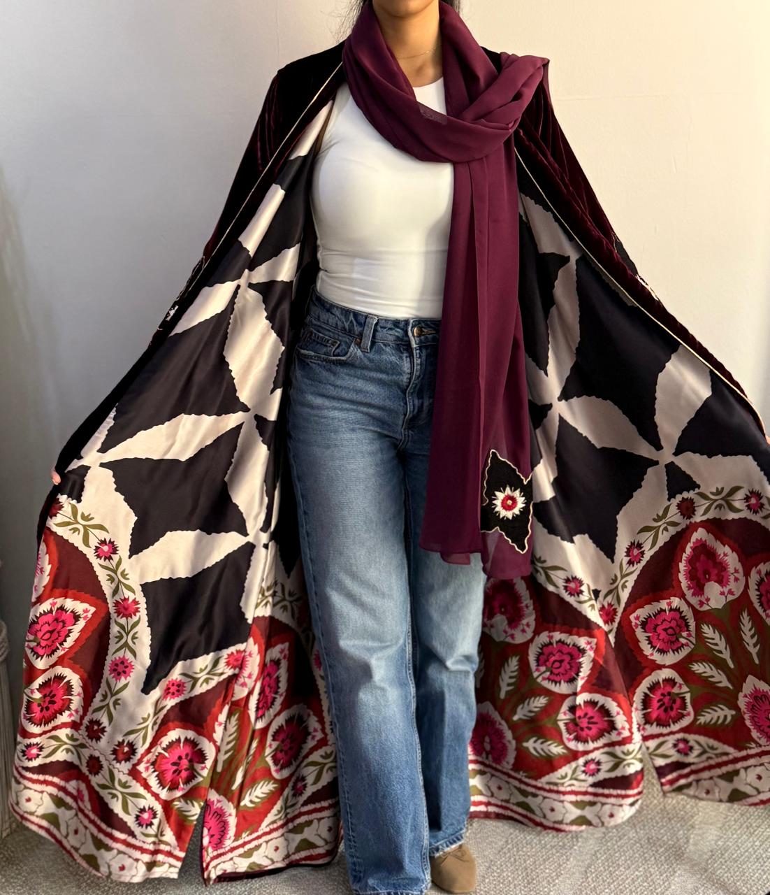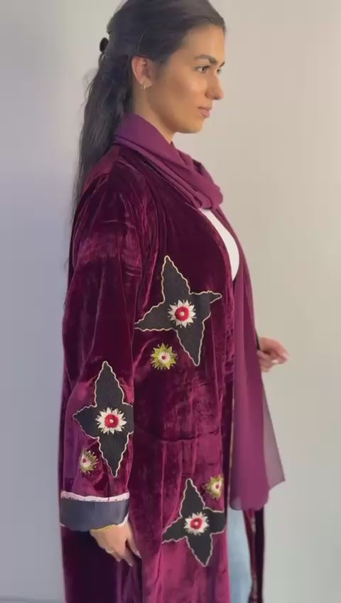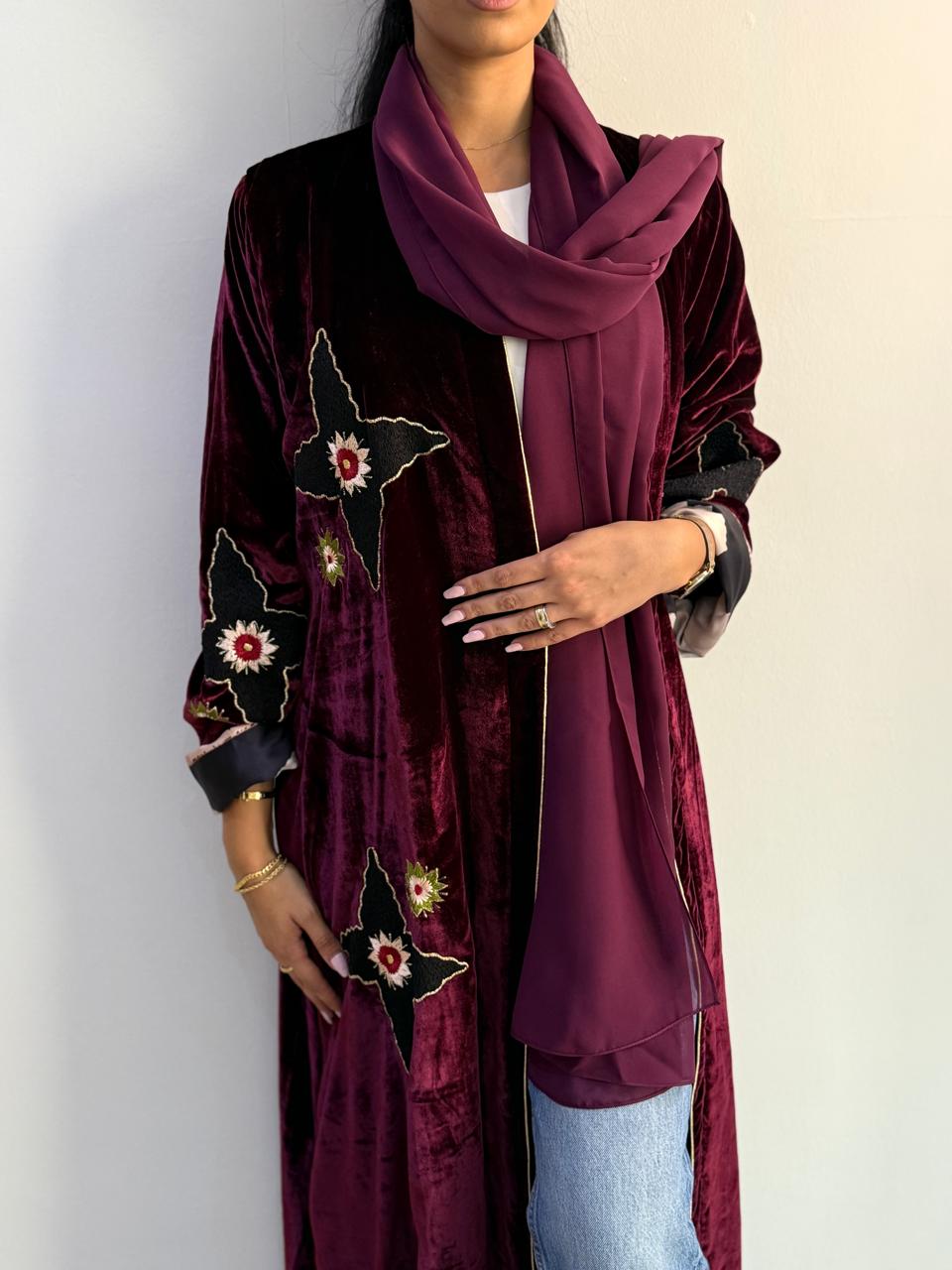 This striking abaya showcases a bold design philosophy, featuring rich burgundy velvet with expert double-faced construction. The luxurious fabric delivers exceptional drape and durability, creating a garment that balances modesty with contemporary flair. Ideal for discerning wearers who appreciate unconventional elegance, this piece demonstrates masterful craftsmanship and premium material selection, making it a distinctive addition to any modest fashion collection.